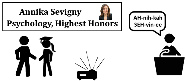 As the student crosses the stage, the announcer speaks the student's name, and the name is projected above the stage.